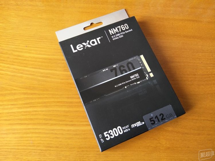 雷克沙固态硬盘的包装是一个可以悬挂的扁盒子,以黑色为主色调,盒子正面有硬盘的图片,上方是雷克沙的logo,右上是产品的型号◆,这款是NM760,左下是明显的读取速度信息,这款SSD的读取速度可以达到5300MB/s=•●,右下角标明了硬盘的容量,512GB。